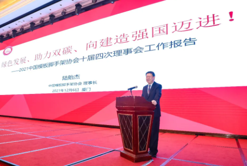 陸貽杰作了“綠色發(fā)展、助力雙碳,向模架強國邁進”的工作報告。系統(tǒng)總結了2021年協(xié)會主要工作,深入開展各項會員服務,在推動行業(yè)科技技術進步,促進行業(yè)高質(zhì)量發(fā)展取得卓有成效成果!笆奈濉泵媾R新的機遇,產(chǎn)業(yè)迎來巨大的發(fā)展空間。綠色發(fā)展,未雨綢繆,實現(xiàn)建造過程“節(jié)能環(huán)保、提高效率、提升品質(zhì)、保障安全”,需要持之以恒的努力。